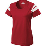 A home-run style with mesh and solid print stripes on the sleeves. 4.5-ounce, 60/40 ring spun combed cotton/poly, 32 singles Crossover v-neck Curved hem
