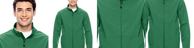8.8 oz., 94% polyester, 6% spandex three-layer breathable soft shell; waterproof and windproof membrane protects from the elements with 3,000 mm waterproof rating and 1,000 g breathability; wind- and water-resistent; center front dyed-to-match reverse coil zipper with semi-autolock rubber pull tab and chin guard; zippered front welt pockets; open hem cuffs ; double-needle stitching at hem and cuffs; open hem with drop back bottom;