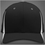 Structured poly-spandex fabric with buckram fused front panels; Color blocked crown and visor inserts. Pre-curved PE visor.